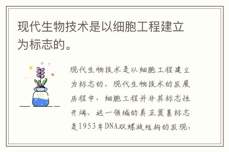 生物技术的核心在于对遗传物质的操控,而这一基础正是由分子生物学的发展奠定的。从1973年基因工程(重组DNA技术) 的诞生,到PCR技术的发明,再到基因测序的突破,每一步都源于对DNA结构和功能的深入理解。细胞工程更像是这些基础技术在细胞层面的应用,而非整个生物技术领域的开端标志。
