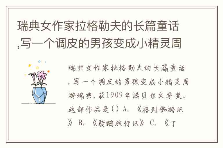 瑞典女作家拉格勒夫的长篇童话,写一个调皮的男孩变成小精灵周游瑞典,获1909年诺贝尔文学奖。这部作品是( ) A. 《格列佛游记》 B. 《骑鹅旅行记》 C. 《丁丁历险记》 D. 《木偶奇遇记》