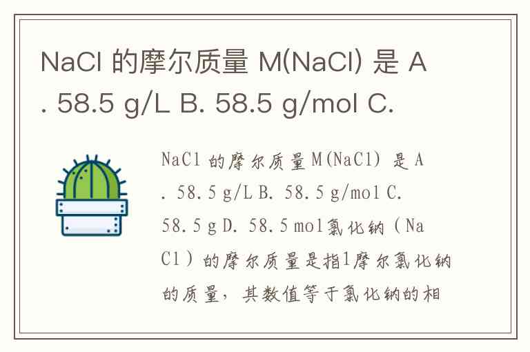 NaCl 的摩尔质量 M(NaCl) 是 A. 58.5 g/L B. 58.5 g/mol C. 58.5 g D. 58.5 mol
