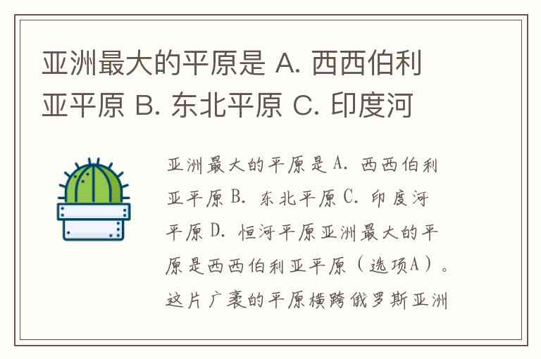亚洲最大的平原是 A. 西西伯利亚平原 B. 东北平原 C. 印度河平原 D. 恒河平原