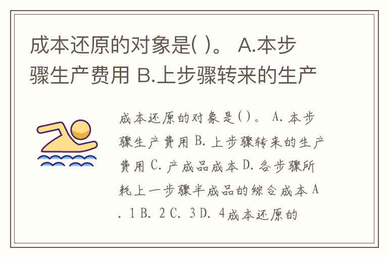 这一结论可从多方面得到验证:文档2直接指出答案为该选项;文档5、7、8、9均强调还原对象是各步骤耗用的上一步骤半成品综合成本;从原理看,综合结转分步法下,前面步骤的直接人工、制造费用等会被归入“半成品”项目,只有分解这些综合成本才能反映真实成本结构。