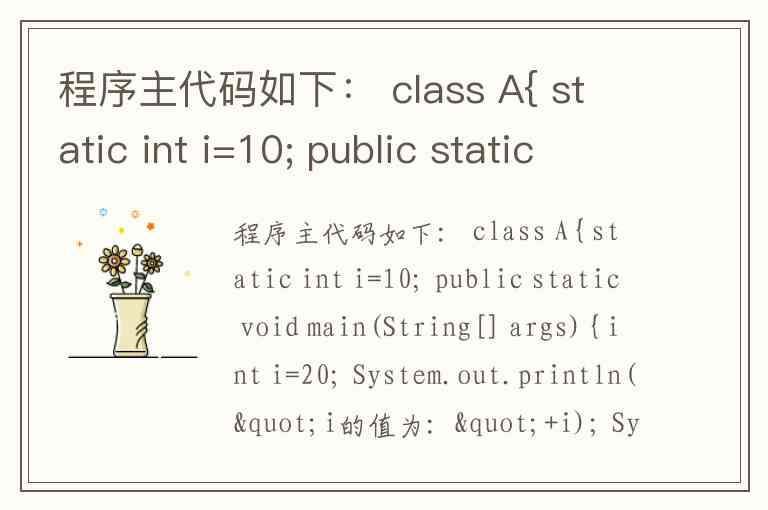 程序主代码如下: class A{ static int i=10; public static void main(String[] args){ int i=20; System.out.println("i的值为:"+i); System.out.println("i的值为:"+A.i); } } A. 10 20 B. 20 10 C. 10 10 D. 20 20