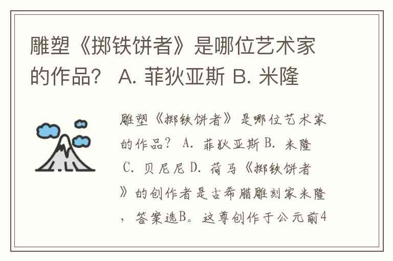 《掷铁饼者》的创作者是古希腊雕刻家米隆,答案选B。这尊创作于公元前450年左右的青铜雕塑,以精准捕捉运动员投掷瞬间的动态平衡著称,是古希腊古典时期艺术的巅峰代表之一。