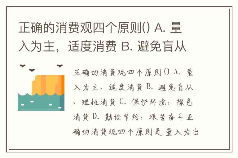 正确的消费观四个原则() A. 量入为主,适度消费 B. 避免盲从,理性消费 C. 保护环境,绿色消费 D. 勤俭节约,艰苦奋斗