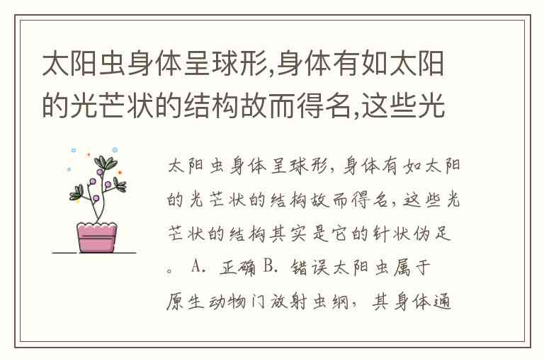 太阳虫身体呈球形,身体有如太阳的光芒状的结构故而得名,这些光芒状的结构其实是它的针状伪足。 A. 正确 B. 错误
