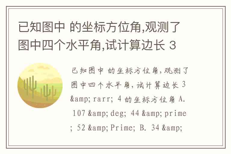 已知图中 的坐标方位角,观测了图中四个水平角,试计算边长 3 → 4 的坐标方位角 A. 107 ° 44 ′ 52 ″ B. 34 ° 01 ′ 24 ″ C. 124 ° 54 ′ 12 ″ D. 244 ° 29 ′ 58 ″