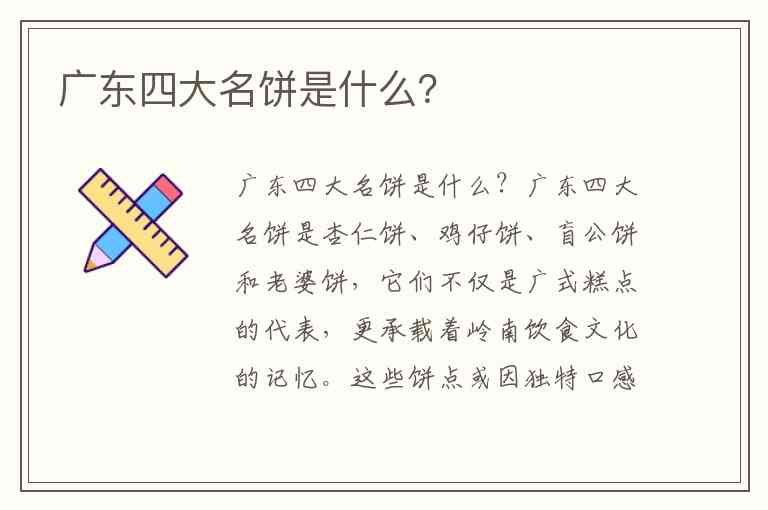 广东四大名饼是杏仁饼、鸡仔饼、盲公饼和老婆饼,它们不仅是广式糕点的代表,更承载着岭南饮食文化的记忆。这些饼点或因独特口感流传百年,或以传奇故事闻名遐迩,共同构成了老广“以饼寄情”的生活方式。