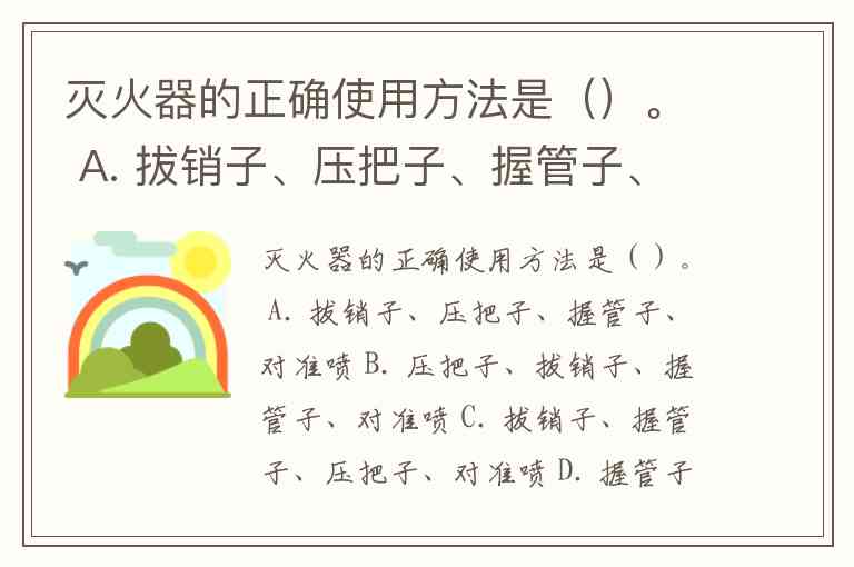 灭火器的正确使用方法是()。 A. 拔销子、压把子、握管子、对准喷 B. 压把子、拔销子、握管子、对准喷 C. 拔销子、握管子、压把子、对准喷 D. 握管子、拔销子、压把子、对准喷