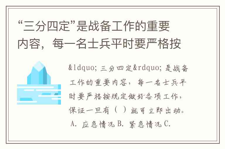 “三分四定”是战备工作的重要内容,每一名士兵平时要严格按规定做好各项工作,保证一旦有( )就可立即出动。 A. 应急情况 B. 紧急情况 C. 不法分子 D. 紧急任务