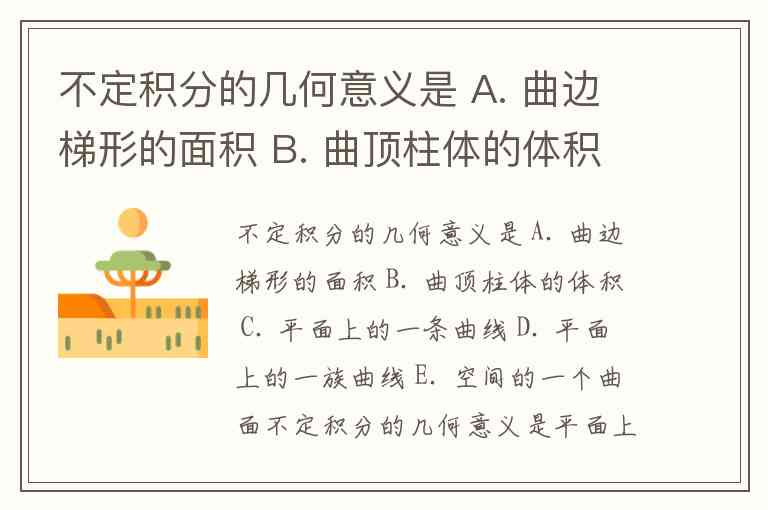 不定积分的几何意义是 A. 曲边梯形的面积 B. 曲顶柱体的体积 C. 平面上的一条曲线 D. 平面上的一族曲线 E. 空间的一个曲面