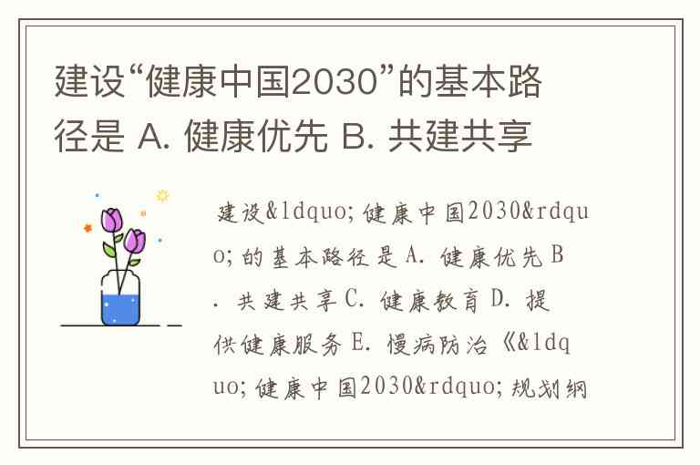 建设“健康中国2030”的基本路径是 A. 健康优先 B. 共建共享 C. 健康教育 D. 提供健康服务 E. 慢病防治