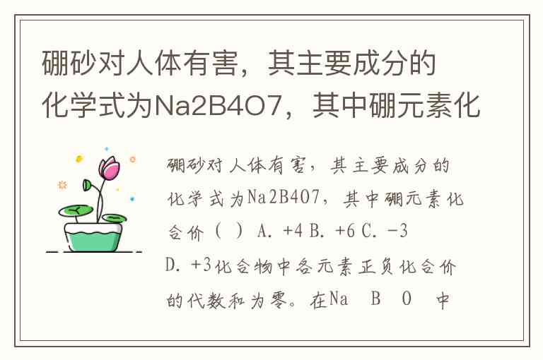 化合物中各元素正负化合价的代数和为零。在Na₂B₄O₇中,钠元素显+1价,氧元素显-2价,设硼元素的化合价为x,则:(+1)×2 + 4x + (-2)×7 = 0解得 x=+3