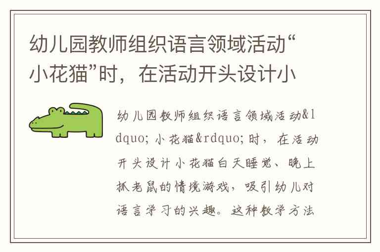 幼儿园教师组织语言领域活动“小花猫”时,在活动开头设计小花猫白天睡觉、晚上抓老鼠的情境游戏,吸引幼儿对语言学习的兴趣。这种教学方法是 ( ) A. 游戏法 B. 实操法 C. 直观法 D. 口授法