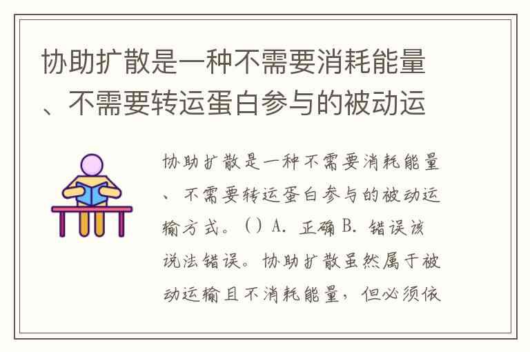 协助扩散是一种不需要消耗能量、不需要转运蛋白参与的被动运输方式。( ) A. 正确 B. 错误