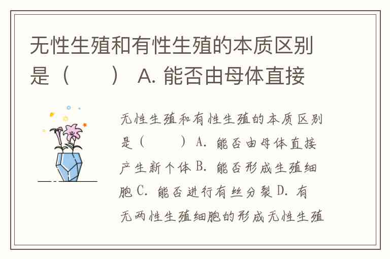 无性生殖与有性生殖的本质区别在于是否涉及两性生殖细胞的结合。例如人类通过精子与卵子结合的有性生殖,和细菌直接分裂的无性生殖,核心差异就在于有无生殖细胞的融合过程。
