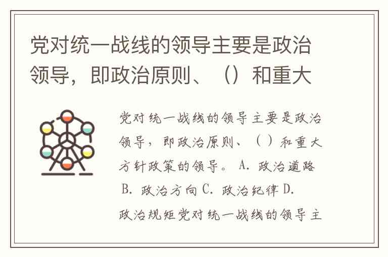 党对统一战线的领导主要是政治领导,即政治原则、()和重大方针政策的领导。 A. 政治道路 B. 政治方向 C. 政治纪律 D. 政治规矩
