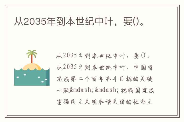 从2035年到本世纪中叶,中国将完成第二个百年奋斗目标的关键一跃——把我国建成富强民主文明和谐美丽的社会主义现代化强国。这一战略安排源自党的十九大确立的“两步走”部署:在2035年基本实现社会主义现代化的基础上,通过30年持续奋斗,全面提升国家综合实力与国际影响力,最终实现中华民族伟大复兴的中国梦。