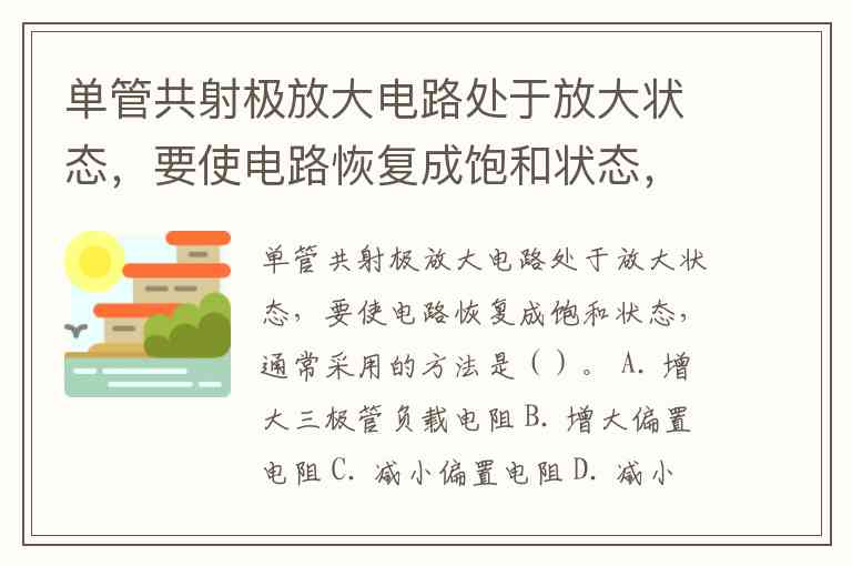 单管共射极放大电路处于放大状态,要使电路恢复成饱和状态,通常采用的方法是()。 A. 增大三极管负载电阻 B. 增大偏置电阻 C. 减小偏置电阻 D. 减小三极管负载电阻 E. 提高电源电压