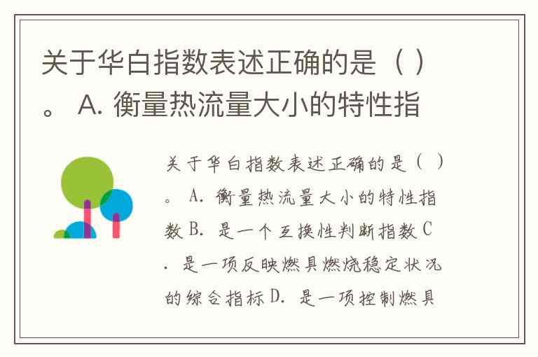 关于华白指数表述正确的是( )。 A. 衡量热流量大小的特性指数 B. 是一个互换性判断指数 C. 是一项反映燃具燃烧稳定状况的综合指标 D. 是一项控制燃具热负荷恒定状况的指标