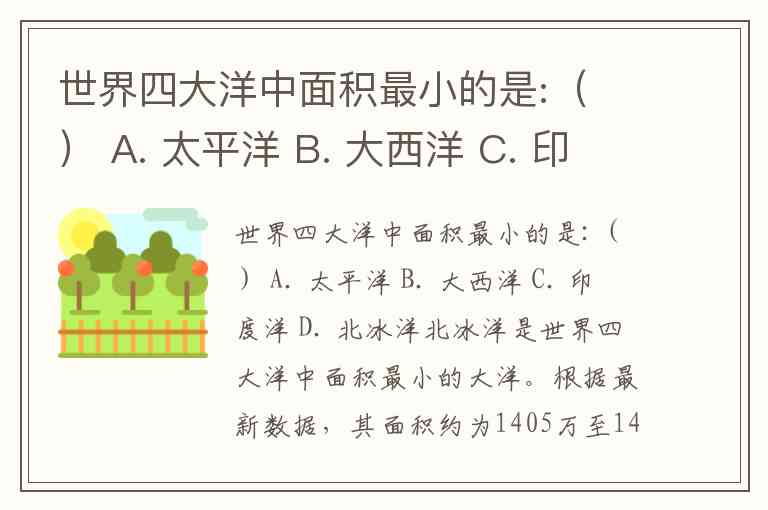 世界四大洋中面积最小的是:( ) A. 太平洋 B. 大西洋 C. 印度洋 D. 北冰洋