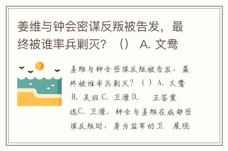 姜维与钟会密谋反叛被告发,最终被谁率兵剿灭?() A. 文鸯 B. 吴班 C. 卫灌 D. 郤正