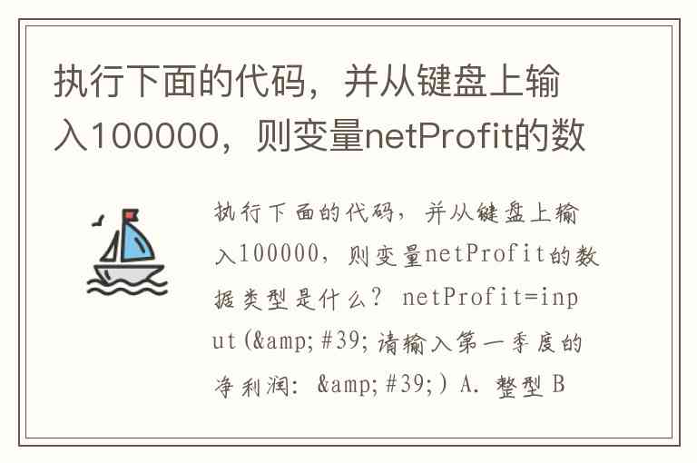 执行下面的代码,并从键盘上输入100000,则变量netProfit的数据类型是什么? netProfit=input('请输入第一季度的净利润:') A. 整型 B. 字符型 C. 浮点型 D. 100000