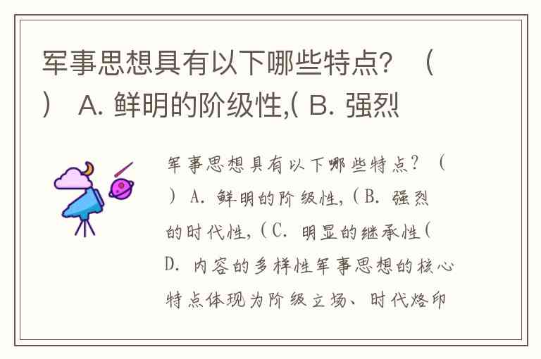 军事思想具有以下哪些特点?() A. 鲜明的阶级性,( B. 强烈的时代性,( C. 明显的继承性( D. 内容的多样性