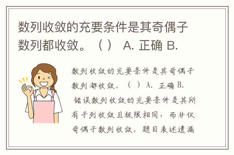 数列收敛的充要条件是其所有子列收敛且极限相同,而非仅奇偶子数列收敛。题目表述遗漏了极限必须相等的关键条件,因此答案为B. 错误。