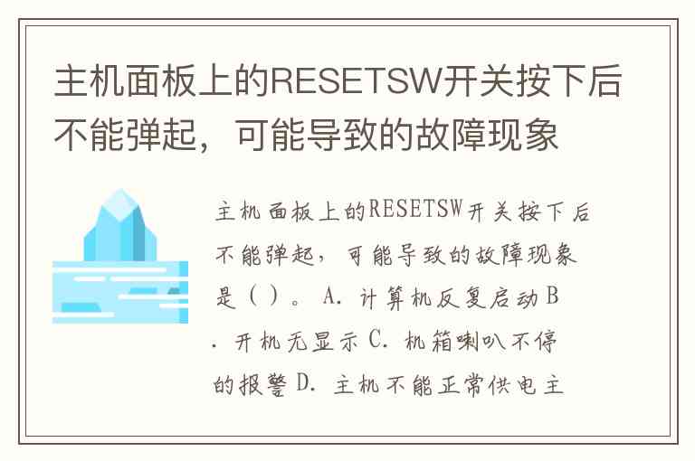 主机面板上的RESETSW开关按下后不能弹起,可能导致的故障现象是()。 A. 计算机反复启动 B. 开机无显示 C. 机箱喇叭不停的报警 D. 主机不能正常供电