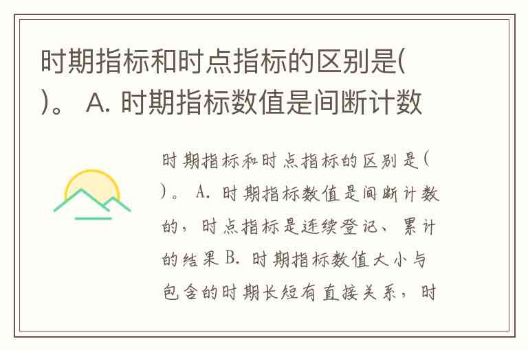 时期指标和时点指标的区别是( )。 A. 时期指标数值是间断计数的,时点指标是连续登记、累计的结果 B. 时期指标数值大小与包含的时期长短有直接关系,时点指标数值大小与其时间间隔长短无直接关系 C. 时期指标数值是连续登记、累计的结果,时点指标数值是间断计数的 D. 不同时期指标数值具有可加性,不同时点的指标数值不具有可加性 E. 时点指标数值大小与包含的时期长短有直接关系,时期指标数值大小与其时间间隔长短无直接关系