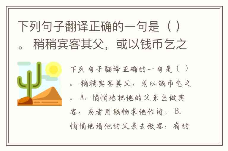 下列句子翻译正确的一句是( )。 稍稍宾客其父,或以钱币乞之。 A. 悄悄地把他的父亲当做宾客,或者用钱物求他作诗。 B. 悄悄地请他的父亲去做客,有的人就用钱物求他作诗。 C. 渐渐地请他的父亲去做客,或者用钱物求他作诗。 D. 渐渐地请他的父亲去做客,有的人还用钱物请他作诗。