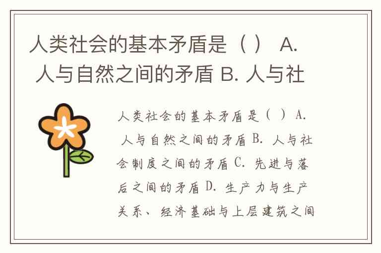 人类社会的基本矛盾是( ) A. 人与自然之间的矛盾 B. 人与社会制度之间的矛盾 C. 先进与落后之间的矛盾 D. 生产力与生产关系、经济基础与上层建筑之间的矛盾