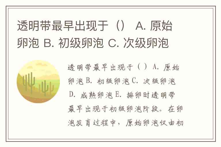 透明带最早出现于() A. 原始卵泡 B. 初级卵泡 C. 次级卵泡 D. 成熟卵泡 E. 排卵时
