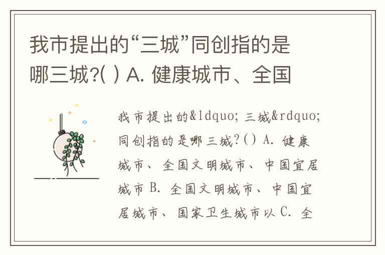 我市提出的“三城”同创指的是哪三城?( ) A. 健康城市、全国文明城市、中国宜居城市 B. 全国文明城市、中国宜居城市、国家卫生城市以 C. 全国文明城市、中国宜居城市、国家园林城市
