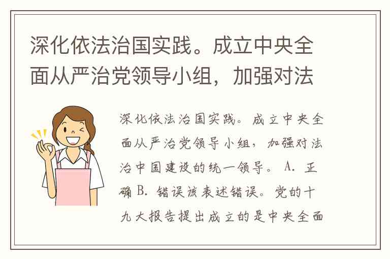 深化依法治国实践。成立中央全面从严治党领导小组,加强对法治中国建设的统一领导。 A. 正确 B. 错误