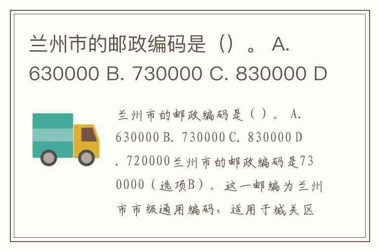兰州市的邮政编码是()。 A. 630000 B. 730000 C. 830000 D. 720000