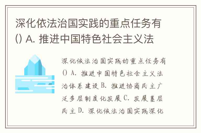 深化依法治国实践的重点任务有() A. 推进中国特色社会主义法治体系建设 B. 推进协商民主广泛多层制度化发展 C. 发展基层民主 D. 深化依法治国实践