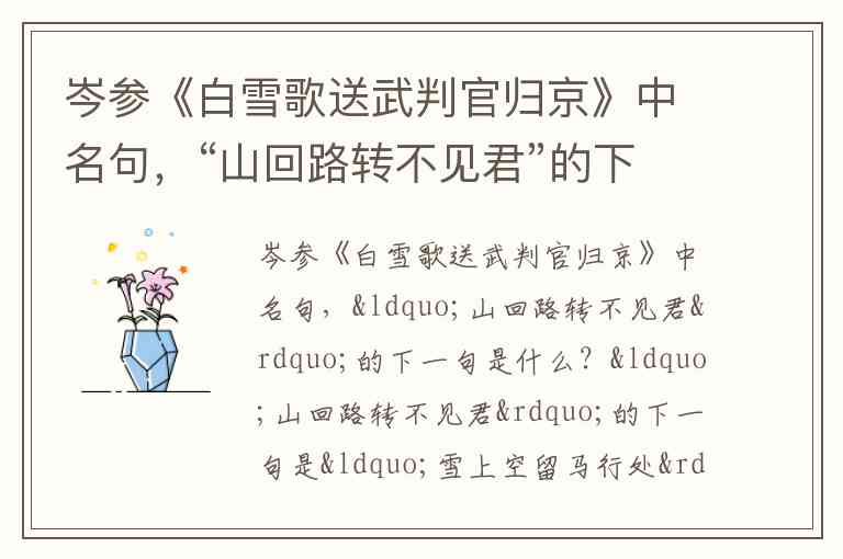 “山回路转不见君”的下一句是“雪上空留马行处”。这两句诗出自岑参《白雪歌送武判官归京》的结尾部分,通过描绘友人身影消失在山路转弯处后,雪地上只留下马蹄印的场景,将送别时的惆怅与边塞雪景的苍茫融为一体,以留白手法传递出余味悠长的离情别绪。全诗以奇丽的雪景起笔,以含蓄的目送作结,成为盛唐边塞诗中情景交融的典范。