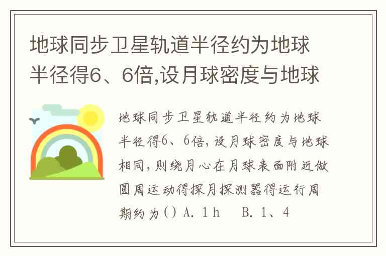 要解决这个问题,需结合万有引力定律和密度公式推导周期与密度的关系。地球同步卫星的周期已知为24小时,轨道半径约为地球半径的6.6倍,可先求出地球表面卫星的周期,再利用密度相同的条件得出月球表面卫星的周期。