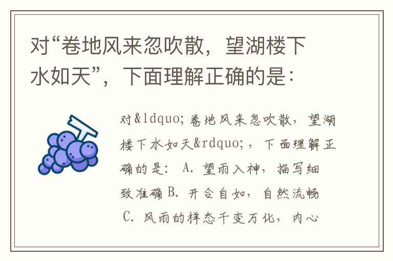 对“卷地风来忽吹散,望湖楼下水如天”,下面理解正确的是: A. 望雨入神,描写细致准确 B. 开合自如,自然流畅 C. 风雨的样态千变万化,内心波动、平静、超然 D. 写出了风雨的欢腾热闹