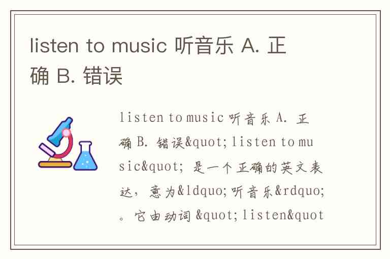 "listen to music" 是一个正确的英文表达,意为“听音乐”。它由动词 "listen"(听)加上介词 "to" 和名词 "music"(音乐)构成,符合英语语法中“listen to + 宾语”的固定搭配要求。这种表达在日常交流和书面语中都十分常用,例如 "I like to listen to music while studying"(我喜欢边学习边听音乐)。