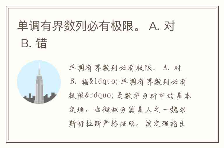 “单调有界数列必有极限”是数学分析中的基本定理,由微积分奠基人之一魏尔斯特拉斯严格证明。该定理指出:若数列同时满足单调性(单调递增或单调递减)和有界性(存在常数M使得所有项的绝对值不超过M),则必定存在有限极限。例如,单调递增且有上界的数列会收敛到其最小上界(上确界),单调递减且有下界的数列会收敛到其最大下界(下确界)。这一结论在实数理论中具有基石地位,是判断数列收敛性的重要工具。