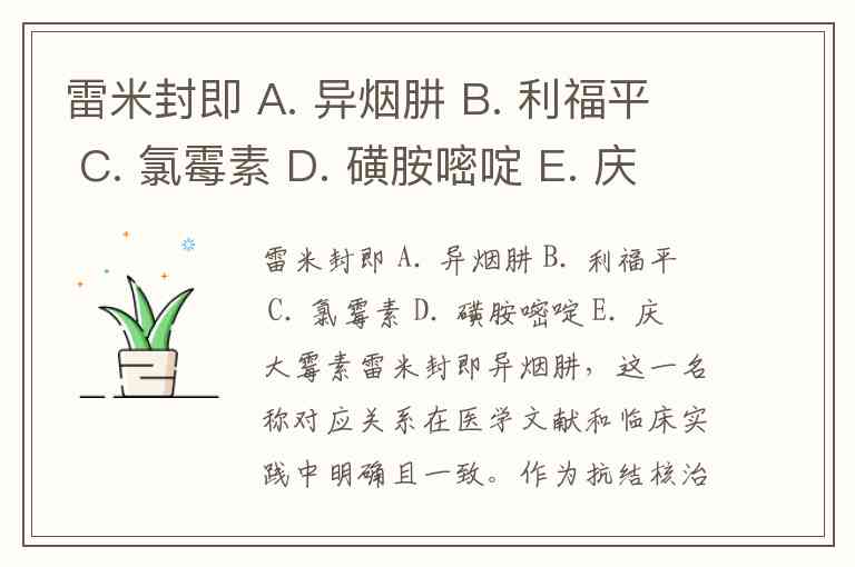 雷米封即 A. 异烟肼 B. 利福平 C. 氯霉素 D. 磺胺嘧啶 E. 庆大霉素