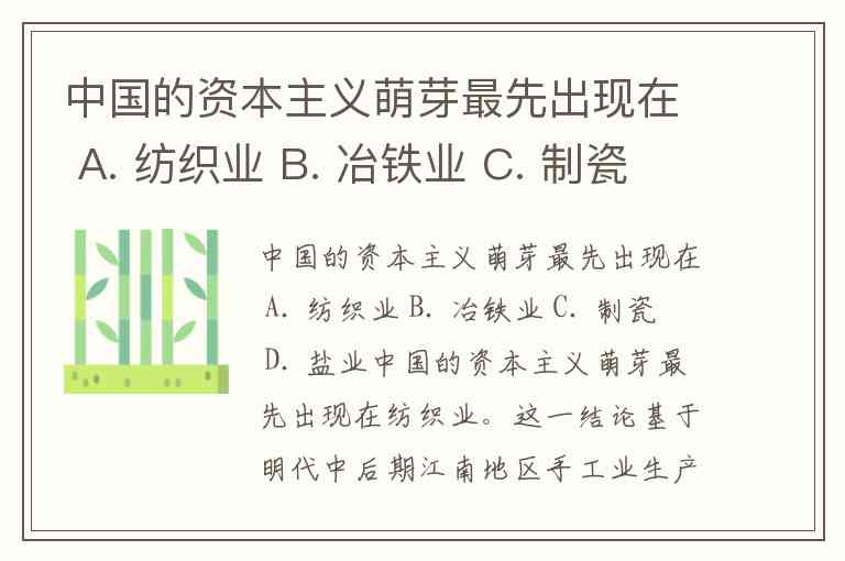 中国的资本主义萌芽最先出现在 A. 纺织业 B. 冶铁业 C. 制瓷 D. 盐业