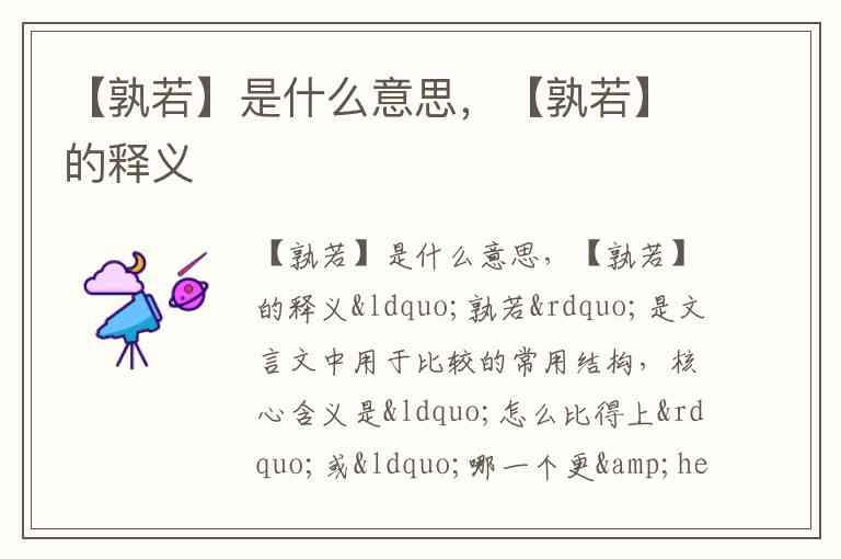 “孰若”是文言文中用于比较的常用结构,核心含义是“怎么比得上”或“哪一个更……”,通过反问语气强调两个事物的优劣对比。它由疑问代词“孰”(谁、哪个)和动词“若”(比得上、像)组合而成,既可以独立使用,也常与“与其”搭配形成“与其……孰若……”的固定句式。