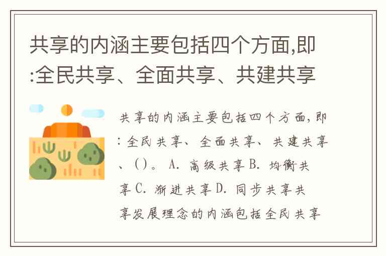 共享的内涵主要包括四个方面,即:全民共享、全面共享、共建共享、( )。 A. 高级共享 B. 均衡共享 C. 渐进共享 D. 同步共享