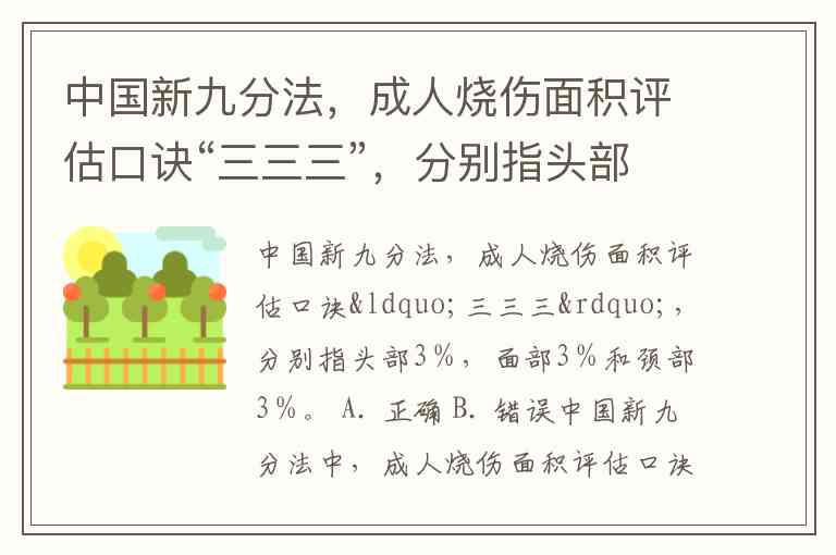 中国新九分法,成人烧伤面积评估口诀“三三三”,分别指头部3%,面部3%和颈部3%。 A. 正确 B. 错误