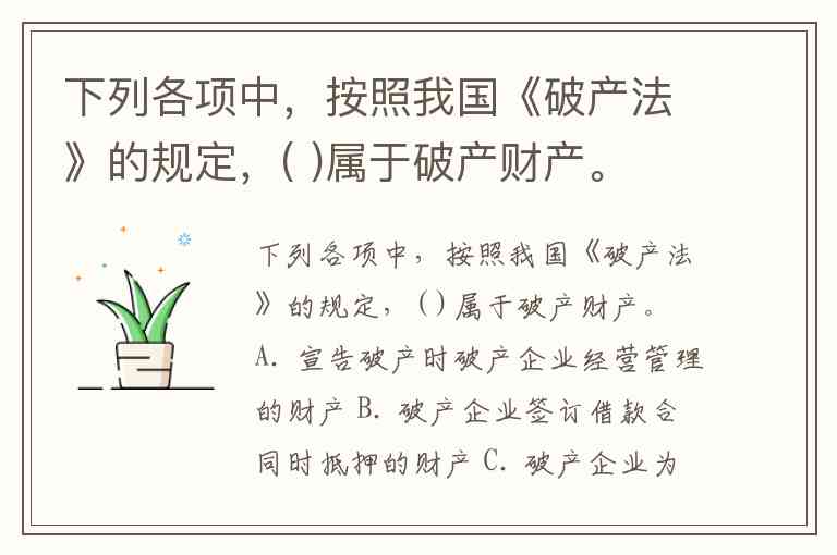 下列各项中,按照我国《破产法》的规定,( )属于破产财产。 A. 宣告破产时破产企业经营管理的财产 B. 破产企业签订借款合同时抵押的财产 C. 破产企业为定做人加工的物品 D. 破产企业在破产宣告后至破产程序终结前从联营企业分得的利润