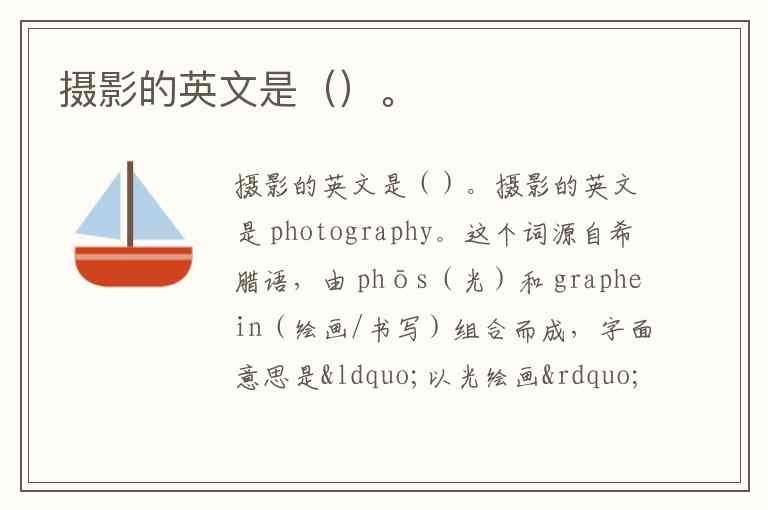 摄影的英文是 photography。这个词源自希腊语,由 phōs(光)和 graphein(绘画/书写)组合而成,字面意思是“以光绘画”。这一命名精准概括了摄影的本质——通过捕捉和记录光线来创作图像的艺术与技术。