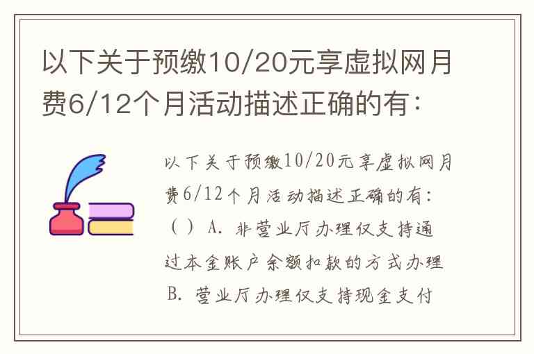 以下关于预缴10/20元享虚拟网月费6/12个月活动描述正确的有:() A. 非营业厅办理仅支持通过本金账户余额扣款的方式办理 B. 营业厅办理仅支持现金支付方式办理 C. 活动办理当月生效 D. 优惠到期后虚拟网月费按原价收取